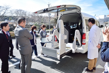 寄贈いただきました福祉車両は電動介護リフトが装備され、ストレッチャータイプの車椅子1台が余裕をもって乗せることができます。また、車椅子やストレッチャーの固定具が手動から電動になり固定力が増し利用しやすくなりました。