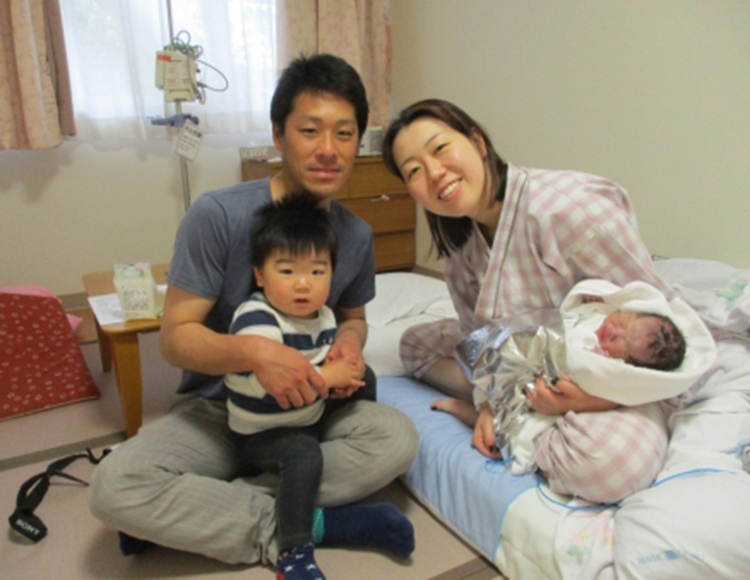 5月出産の予定が家族みんなに早く会いたくて産まれてきた男の子♪ 赤ちゃんが産まれて来るときにはお兄ちゃんもママの身体を支えたり、 パパと団扇で扇いでくれたりとてもがんばっていました(^^)/ その姿に助産師2人も癒されました♪♪ ママは最後まで冷静に状況を確認しながらお産していました。流れ石(正二先生談)! 写真からも良い家族のオーラ満載ですね☆ 家族みんなで育児を楽しんで下さいね! ご出産おめでとうございます♪