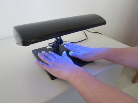 しっかり洗ったつもりでも、ブラックライトに手をかざせば意外に汚れが残っています。