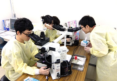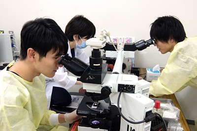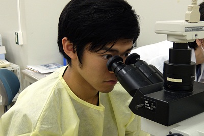 大きく目を見開いて顕微鏡を覗く1年目M先生☆