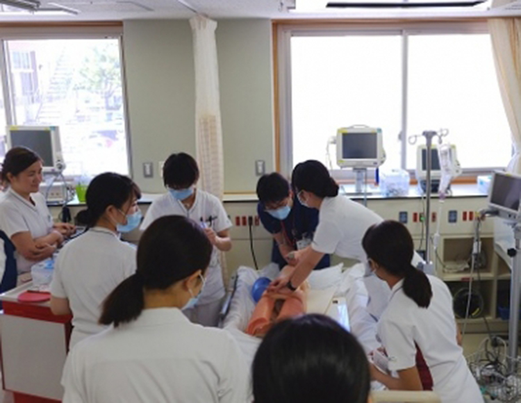入院病棟の若手看護師さん達の 急変時対応訓練があり、 救急科ローテート中の2年目研修医N先生と、 先月2ヶ月間ローテートを終えたばかりのF先生が Dr.役で参加しました!先輩看護師さんの指導の下、 新米看護師さんたちが何度も訓練を繰り返していきます☆ N先生にコールがかかり、 患者さん(人形)のもとに駆けつけます!看護師さんからの気管チューブを受け取るN先生 「挿管なら僕に任せて!」 と聞こえてきそうな、真剣な表情です^^こちらは先日、ドクターヘリにも搭乗したF先生☆人形の喉と気管チューブが 滑りにくい素材のため、 上手くはいらない状況に。。。 何度か試して、難