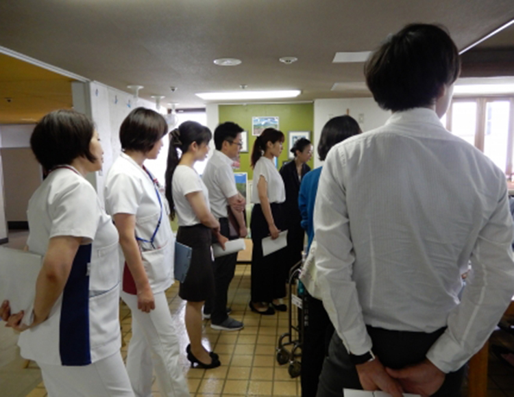 7月20日、関西ろうさい病院の7名の方々が、 当院の高齢者集団ケアの見学にいらっしゃいました。 看護、リハビリ、そしてボランティアの方々です。 当院で取り組んでいる、A5病棟、F3病棟、 C4病棟を順次見学して帰られました。 ボランティアの方々がどのような活動をするのか、 今後の取り組みを情報交換したいと思いました。