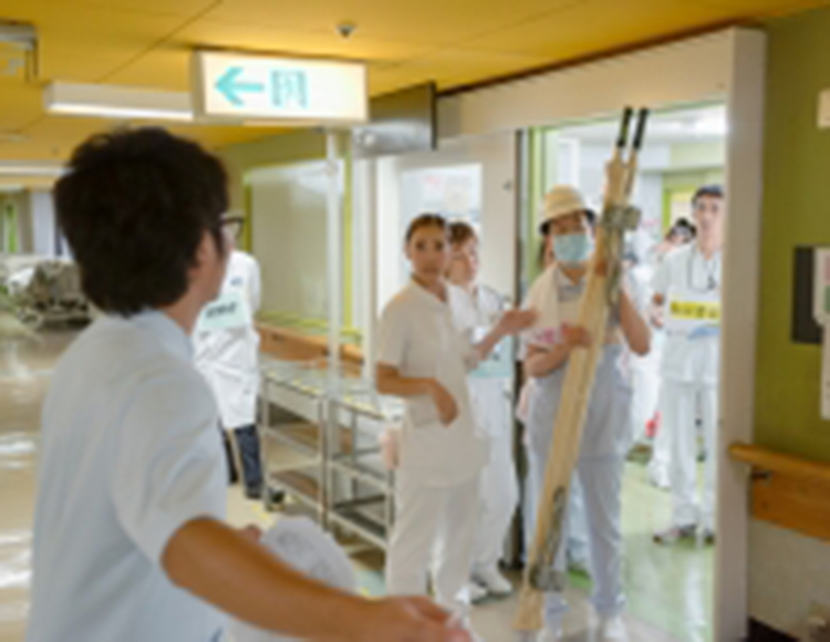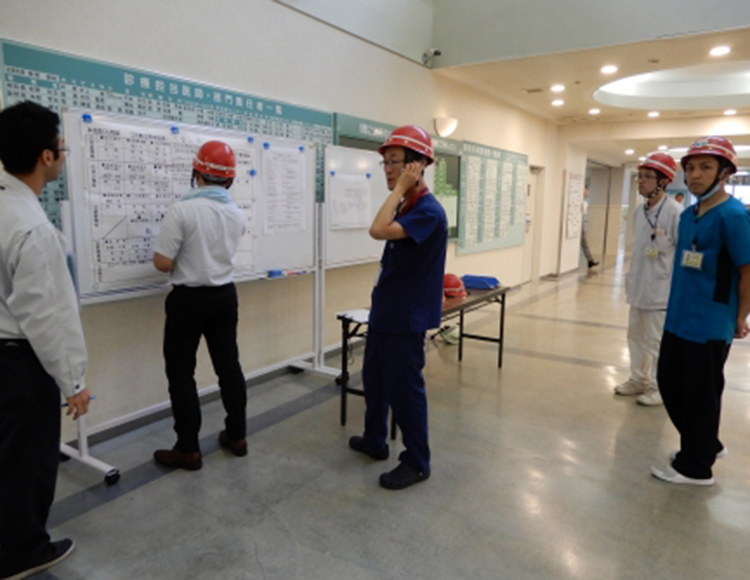 7月26日の17時30分から平成30年度夜間火災総合訓練を実施しました。 「A4病棟で火災発生」という想定で、災害対応マニュアルに沿って実践形式で実施し、出火場所の確認、通報、初期消火、患者さんの避難誘導などの各種活動、本部機能の確認を行いました。 約30分の実践訓練の後に、患者役職員をふくめた参加者全員の講評、さらに担当病棟のスタッフ、当院防災委員、病院長、看護部長、事務長を交えた反省会を開催しました。実施内容の確認や改善点について意見交換をおこない、火災現場の職員だけではなく、応援スタッフや職場間の連携などの重要性を再確認することができました。