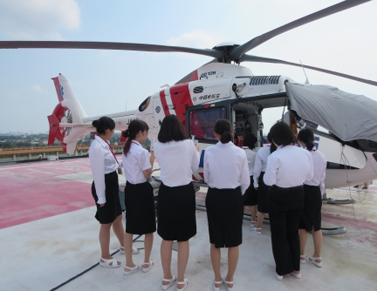 国際医療管理専門学校1年生が病院見学にきました。 当院の概要の説明、メディカルクラークとして働く先輩職員(国際医療管理専門学校卒業生)、 外来医事課の方のお話を聞き、その後病院内を見学しました。人気ドラマの映画がもうすぐ公開とあって、近くで見るドクターヘリに喜びの声。 もう少し、ゆっくりしたいところでしたが、 屋上で日差しを遮るものもないので、早々に退散... 働いていて大変なこと、うれしかったこと、移動中に見たあの部屋は?など質問も出て 有意義な時間となっていたら嬉しいです。 この見学で病院への理解を深め、進路を考える良い機会になったらいいなと思います。 一緒