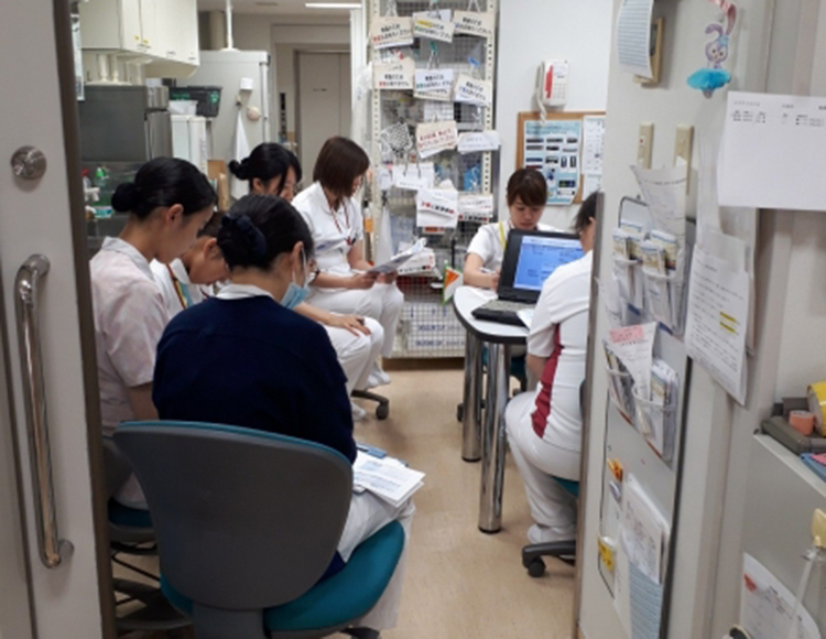 30日は14時頃からラウンドに行きました。 7階の透析室、化学療法室から順にくるくると 下の階に降りてまわってきました。 透析室は回収の時間で忙しそうな時間でした。 F6病棟に行くとシーンとしていて・・・? 集まっているようですがカンファレンスにしては 静かなだなぁと思っていると がんCNSの佐久間さんが「便秘」についての 勉強会をしてくれていました。 資料はパソコンのパワーポイントでも見ることが 出来ました。 ガイドラインを用いながらの説明で、 スタッフも一生懸命メモを取りながら聞いていました。 30日はインターンシップの学生さんが19名 来ていましたので