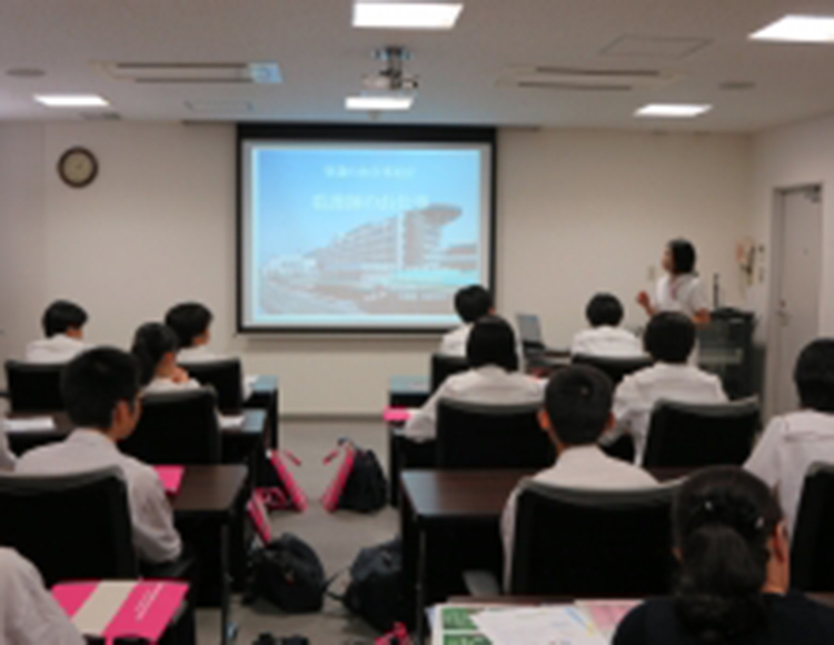高校生への医療・福祉の仕事に対する認知度向上のため、開誠館高等学校の学生さんが施設見学にきました。 施設見学以外に当院では看護師と理学療法士の仕事内容を説明し学生さんからの質問にお答えしました。はじめのうちは緊張していた皆さんですが、 ドクターヘリを見学に行ったら写真を取り合ったり楽しそうに過ごしてくれました。 看護相談室O課長とリハビリテーション部S係長がこの仕事を選んだ理由ややりがいについて説明をしてくださり、熱心に話を聴いていました。今回の体験を通して、将来の医療職者のたまごさんたちがまた聖隷三方原病院へ戻ってきてくれればと願います♪