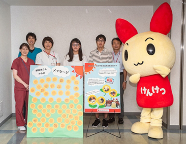 浜松学生献血推進委員会さまより、『献血者さんからのメッセージボード』を頂戴しました。当院では毎年恒例の行事となっています。 夏の青空と太陽を見上げるひまわりをイメージしたメッセージボードは、大型ショッピングモールなどで献血にご協力いただいた方々からメッセージを寄せていただき、学生さんたちの手で制作されたものです。 この企画に参加している学生さん、ご協力いただいている多くの方々、献血者おひとりおひとりに感謝申し上げます。 9月14日まで当院外来受付ロビー前に掲示させてただきます。ご来院の際にはぜひご覧ください。