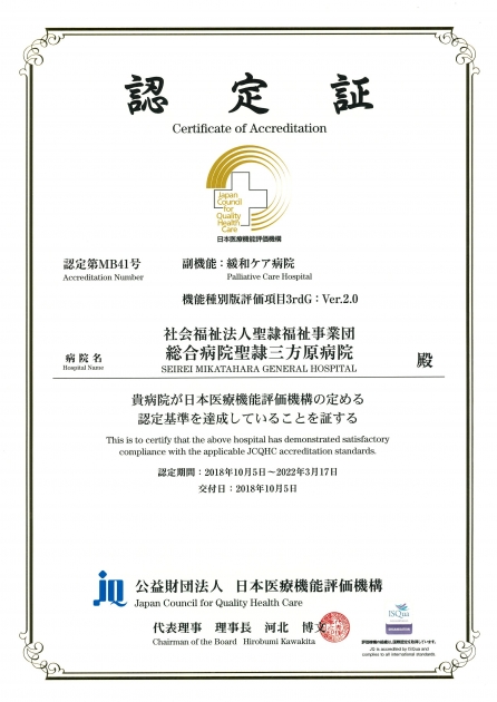日本医療機能評価機構より、病院機能評価の副機能(緩和ケア病院)に認定されました。