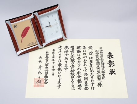 1階窓口会計前自販機コーナーに設置しているハートフルベンダー(募金機能付自販機)を通じ、2018年4月から9月末の間に66,112円の募金・寄付金をいただきました。また永年の共同募金運動に貢献したことにより、平成30年度中央共同募金会会長賞表彰を受賞することができました。