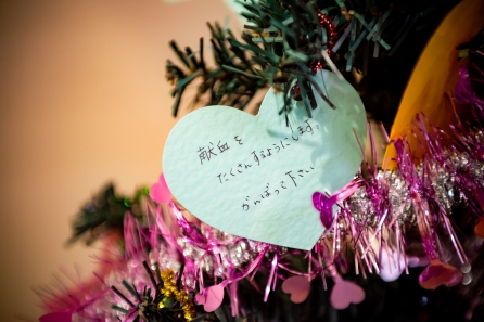 今回のメッセージツリーは、12月2日(日)にイオンモール浜松市野で行われた献血のイベントにて集めたメッセージをクリスマスツリーに飾り付けしたものです。