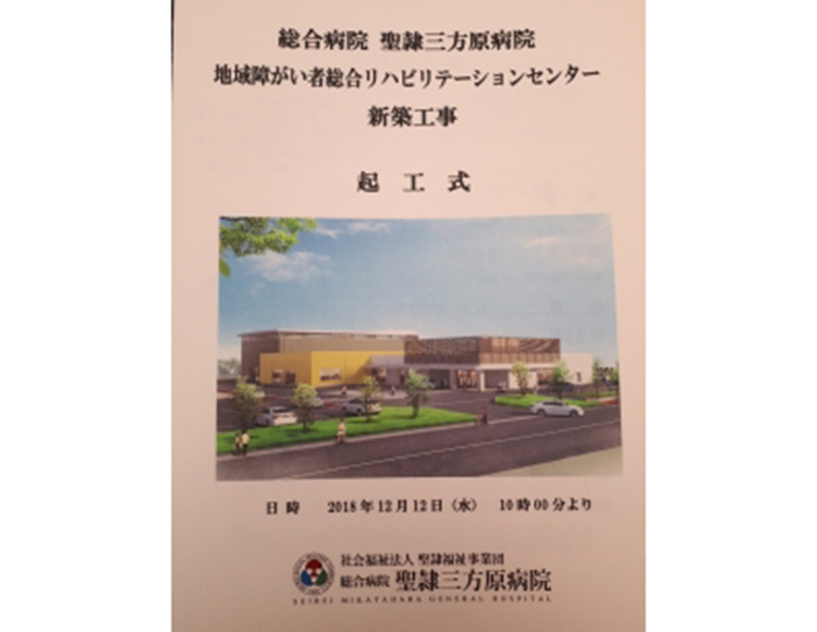 当院では、地域に根ざした障害者支援を目指し「地域障がい者総合リハビリテーションセンター」の設立を予定しております。それに伴い12月12日に新築工事起工式が執り行われ、関係者約50名により工事の無事を祈願しました。 起工式では一般的には神式で行われる場合が多いですが、聖隷では当院のチャプレン(病院牧師)がキリスト教式で起工式を行いました。 鍬入れの際に「エイ」と掛け声を出すのですが、それは「(家が)栄(えますように)」のエイだと言われています。当院から西に400メートルほど離れた土地に建設する予定で、2階建てで診療スペースやアリーナなどの設備が整っており、2019年9月末に完成予定で