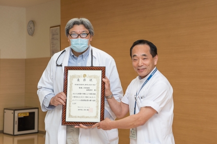 2月1日の朝礼にて、市医療奨励賞(浜松市)を受賞した循環器科と「第47回医療功労賞(読売新聞)」を受賞した整形外科部長 吉田医師の授賞式を行いました。