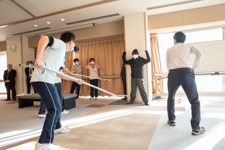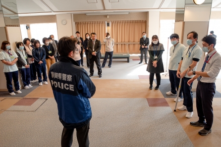 訓練は細江警察署と当施設職員が合同で行い、非常通報装置の運用や刺股の使い方を学びます。