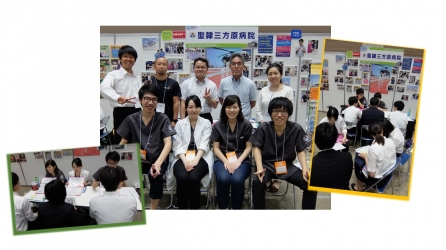 1年目研修医4名(U先生&M先生&S先生&K先生)と臨床研修センター長がブースでお待ちしております。