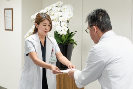 研修医一人一人に臨床研修センター長のS先生から修了証&記念誌&記念品が手渡されます。