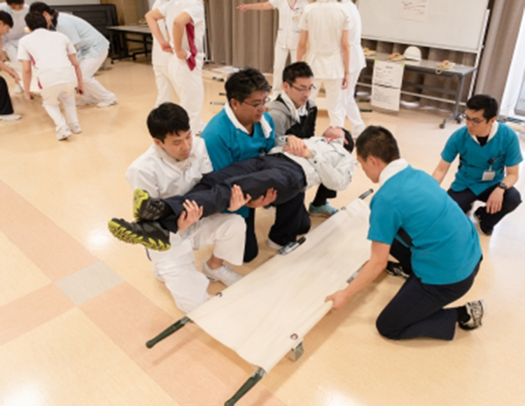 新人職員および異動者向けの防災訓練を、4月18日~19日にかけて行いました。 最初に講義形式で災害発生時の病院職員としての役割と各職種間の協力体制を学びました。 その後、規律訓練から実技訓練へ移行し、初動活動の仕方を学びました。 実技訓練では消火器や消火栓の取り扱い、ストレッチャーや担架を使用しての搬送を実際にやりながら習得しました。訓練に参加した異動者は、 「他施設の訓練と比べると、訓練時間も長く内容も非常に濃いものになっている。 病院職員としての自覚を持つ良いきっかけになった」 と語った。