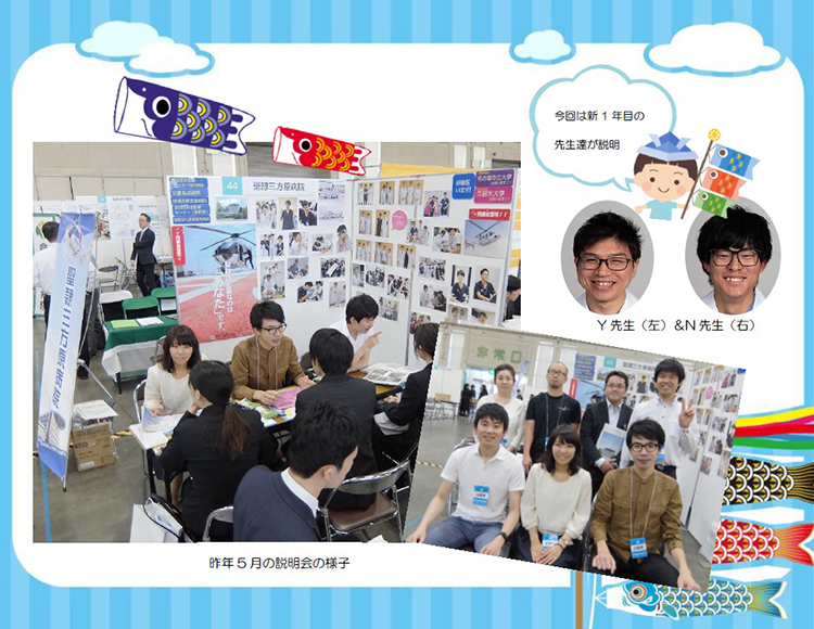 新年度がスタートして初めての募集活動参加です! 新1年目研修医のN先生&Y先生が説明会初デビュー☆ ついこの間まで2名とも医学生さんでしたので、学生さんの悩みや気持ちがよ~くわかってくれています。 整形外科K先生も参加してくれます。 是非、名古屋の説明会で当院の話を聞きにいらしてみませんか? 今年は大型連休なので予定がおありの方も多いと思いますが、研修医達からじっくり話が聞けるチャンスでもありますよ☆☆ 東海北陸地区臨床研修病院合同説明会 5月5日(日)10:00~16:00 吹上ホール