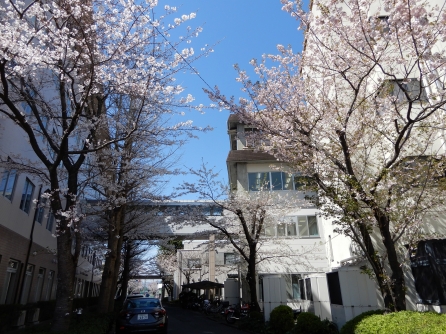 病院周囲の桜は8分咲き、週末には満開になるでしょう。