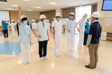 最初に講義形式で災害発生時の病院職員としての役割と各職種間の協力体制を学びました。