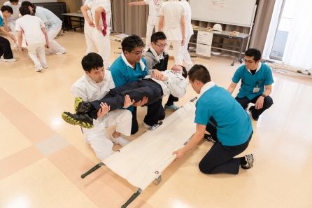 実技訓練では消火器や消火栓の取り扱い、ストレッチャーや担架を使用しての搬送を実際にやりながら習得しました。