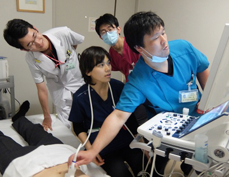 今年度のエコー勉強会がStartしました! 導入編では、2グループに分かれて1年目研修医達が全員参加。 技師さん方による丁寧なレクチャーを受けながら、 一人一人交代して実践♪♪ “LOGIQ e”の基本操作を覚えたので、これでバッチリ救急で使えそうです☆ 両グループとも和気あいあいとした雰囲気で本日の勉強会は1時間ほどで終了♪ 次回は5月22日(水)に行う予定です☆ 医学生さんも見学時にエコー勉強会開催日であれば、見学可能です! 研修医と一緒に勉強してみませんか。 臨床検査部の方々、今年度も引き続きどうぞよろしくお願いします^^