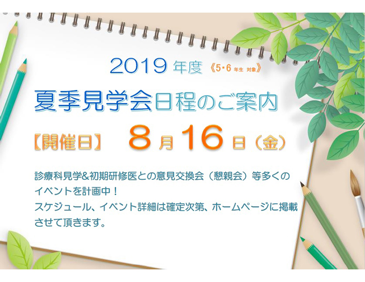 研修医日記2019年度 夏季見学会日程のご案内 5/10(金)