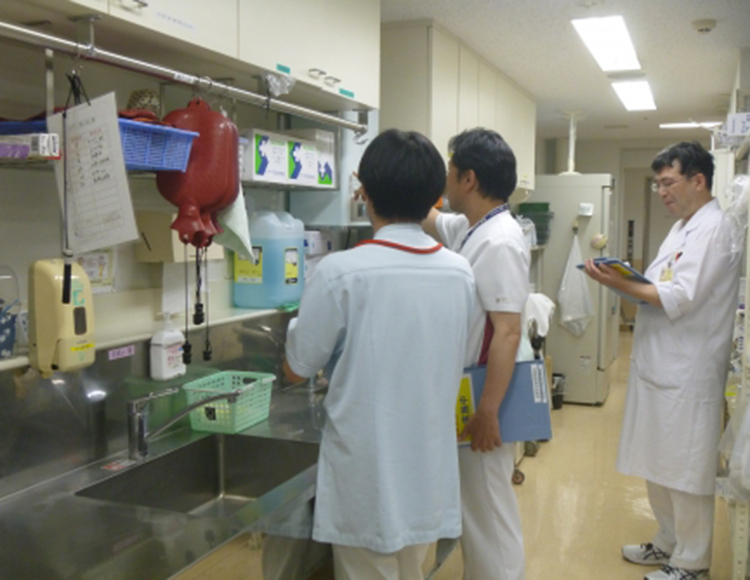 医療安全管理委員会のメンバーを中心に定期的に「安全パトロール」を行っています。20日は私も参加し透析室、化学療法室、F6病棟をまわってきました。外部委員のY先生は医療者でないのですが、率直な意見をもらえるので一緒にラウンドするととても勉強になります。 2グループに分かれてラウンドし、その場ですぐにフィードバック出来ることは伝えてきます。気になるところをパシャパシャと写真をとってきて、パトロール隊で共有し、指摘事項として職場に戻し、改善策を各職場でとってもらいます。職場内で改善出来ないものもあるので、関係部門に伝えていきます。日々はすぐ流れてしまいますが、職場長には、職場を見直すよい機会として