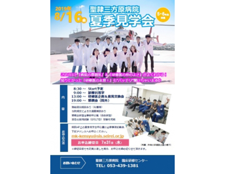2019年度 夏季見学会の詳細についてUPしました。 皆様からの沢山のお申込みをお待ちしております!! 夏季見学会の詳細はこちら【お問合せ先】 聖隷三方原病院 臨床研修センター 〒433-8558 静岡県浜松市北区三方原町3453 電話:053-439-1381(直通) FAX:053-439-1382 E-mail:mk-kensyu@sis.seirei.or.jp