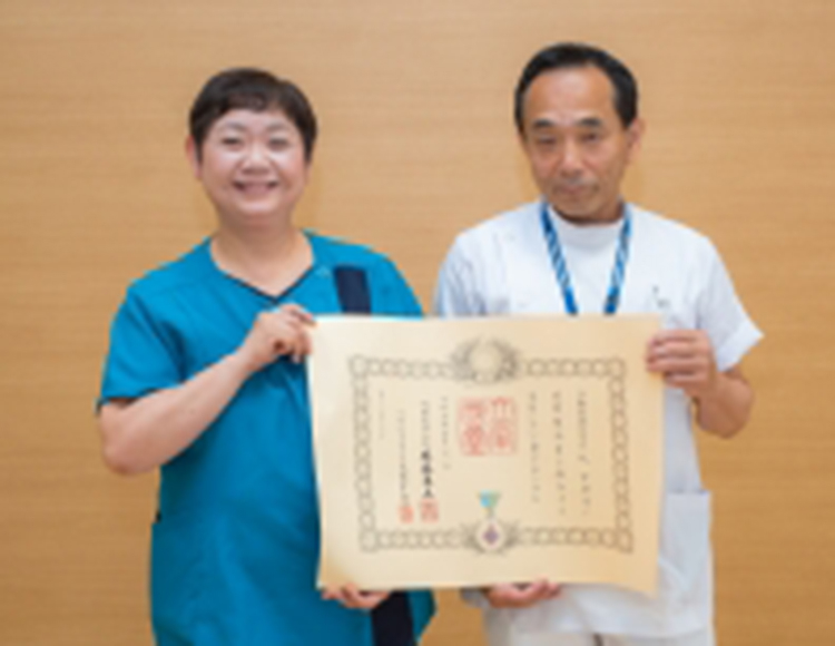 5月に発表された春の叙勲で、当院の臨床検査技師の彦坂百合子さんが瑞宝双光章(ずいほうそうこうしょう)を受章しました。彦坂さんは長年にわたり患者の立場に立ち、自身の溢れんばかりの探究心、研究心を持って多くの功績をあげてきました。 瑞宝双光章とは、日本の勲章の一つで、瑞宝章6つのなかで5番目に位置します。公務等に長年にわたり従事し、成績を挙げた方に授与されます。
