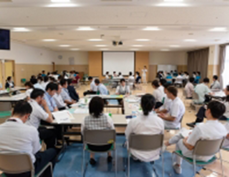 先月、当院大ホールにて職場防災係訓練を行いました。 この訓練は、各職場より防災係が集まり、災害時に備え職場ごとのBCPの策定を進めるものです。 ※BCPとはBusiness Continuity Plan(事業継続計画)といい、非常時に企業が中核業務を再開・復旧するための非常事態マニュアルです。 机上訓練では、昨年策定したBCPを元に各職場が業務内容を整理し、想定される問題についての対応方法を検討しました。そこで浮かび上がった課題について他職場から意見をもらい、より有用なBCPの策定に作り上げました。 訓練の後半には、院内各所にある防災設備を見て回りました。 誘導灯の