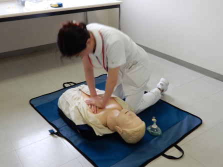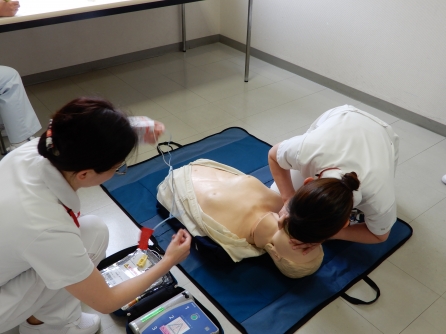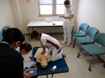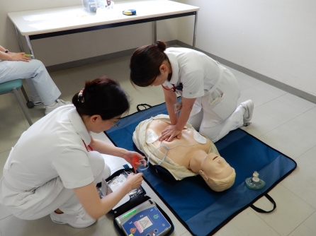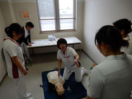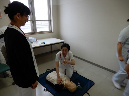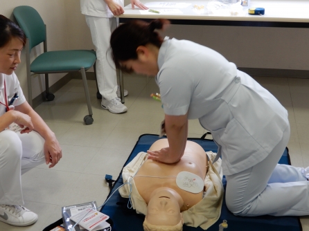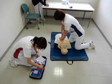 当院職員は新人の時にインストラクターによるBLS研修を受け、その後は毎年全員が毎年BLSの技術確認をします。看護管理室も職場会の時間を活用してBLS訓練を実施しました。