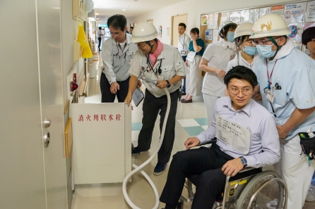 「C4病棟で火災発生」という想定で、出火場所の確認、通報、初期消火、患者さんの避難誘導などの各種活動の確認を行いました。
