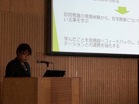 内容は、最初に私の方から5ヶ年戦略の概要をお伝えし、退院支援部門として沖村さん、訪問看護ステーションに出向した太田さん、受け入れてくれた訪問看護ステーション細江のFさん、そして昨年度から同行訪問を企画してくれたおおぞらの春日さんの順に発表し、その後フロア全体で今後の地域連携における人材活用について看護管理者としての討議するという流れです。