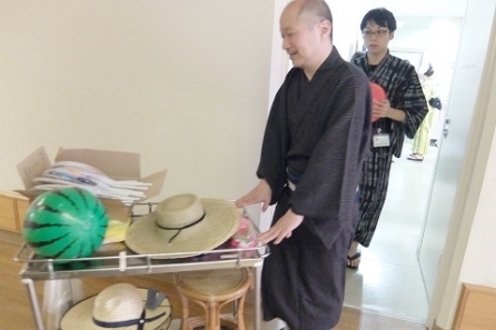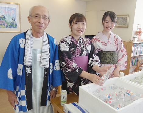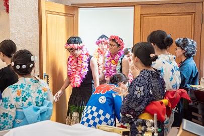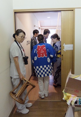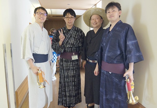 フラの姿からりりしい浴衣姿に着替えたホスピス科の先生方。