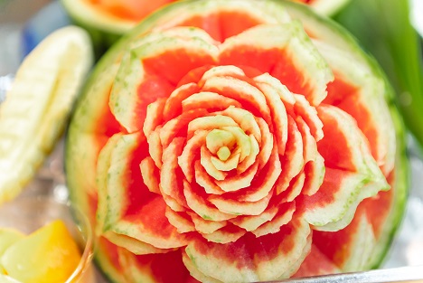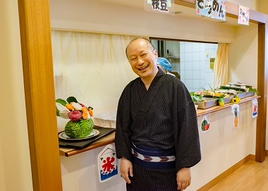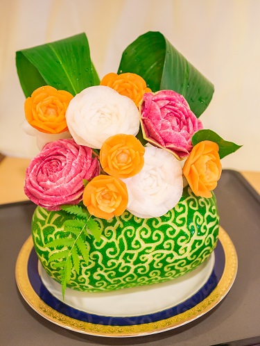 カウンターには冬瓜の花瓶に、大根、人参、ビーツで出来たバラの花々が飾られ、