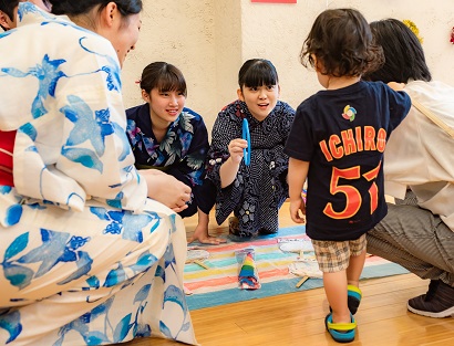 クリストファー大の学生さん達が浴衣姿で好きな色のヨーヨーを手渡してくれます。
