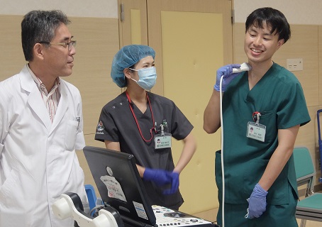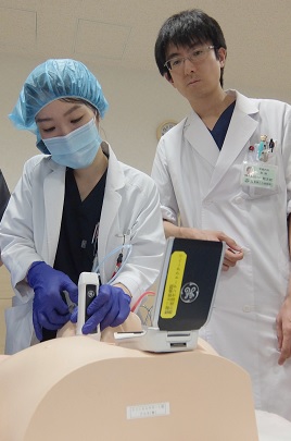 救急科で使用するハンディタイプの「Vscan」を使用してTryする1年目N先生!!!