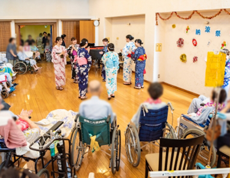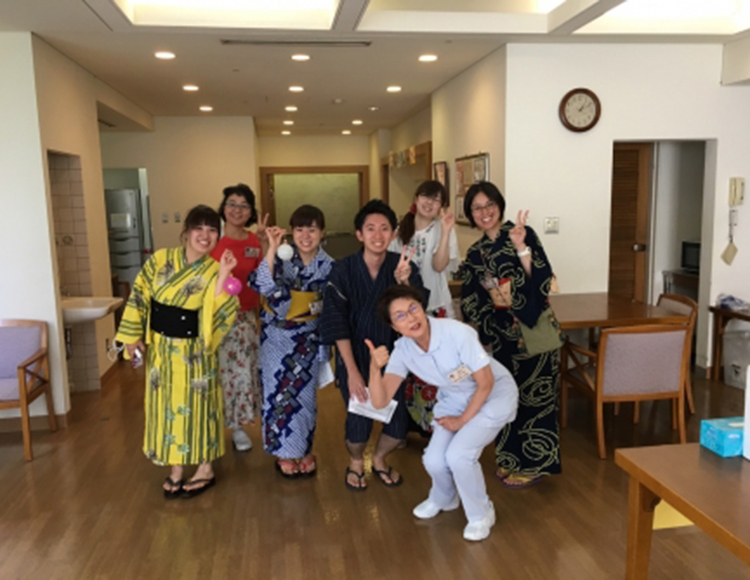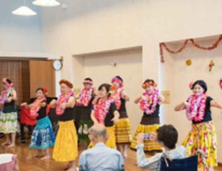 連日の暑さを吹き飛ばすため、ホスピス病棟では納涼祭を毎年行っています。 ホスピス病棟の納涼祭では医師、看護師、クラーク、そして栄養課の職員やボランティアさん、近隣の大学生も参加して盛大に行われました。納涼祭のトリはなんと言ってもホスピス科の先生たちをはじめとする職員によるフラダンスです。 皆さん白衣やユニフォームを原色のパウスカートに履き替え、笑顔を振りまいていました。 笑い声の絶えない楽しい時間となりました。