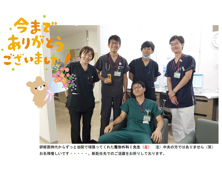 9月に入り晩夏から10月頃まで、あちらこちらにそよ風になびく秋桜を見かけます。 春に咲く桜もそうですが、秋の桜もお別れの季節に咲き、綺麗で可憐ですが何だか少し物寂しいですね。。。。 さて、今日は少し寂しいお別れのお知らせです。。 2015年から当院で初期研修をスタートさせ、当初の志望通り整形外科医となって頑張ってくださっていたI先生が10月から新しい赴任先へ異動となりました。 I先生を慕っていた研修医達も数多くおり少し寂しい気持ちはありますが、I先生へのこれまでの御礼とこれからのご活躍をお祈りしたいと思います。 またいつか当院に戻っていらしてくださいね☆ お待ちしております。