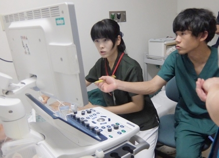 1年目U先生の心エコーの様子を見て、隣で2年目M先生がコツをアドバイス♪