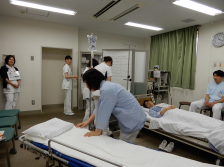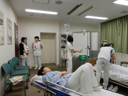 ペアの看護師と一緒に輸血をしようとしているところで認知症の患者さんがそわそわし始めました。奥の補助者役のスタッフが事前の打ち合わせで決めていたようで患者さんに向かいます。患者役の教育委員の演技がうますぎて驚きました(笑)。