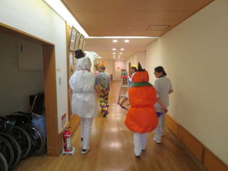 17日の本日、ホスピス病棟では、医師・看護師が仮装をしてお部屋を回り、入院患者さん達と楽しい時間を過ごしました。医師・看護師併せて10名ほどが病棟内を練り歩く姿は、病院とは思えない感じです(笑)。