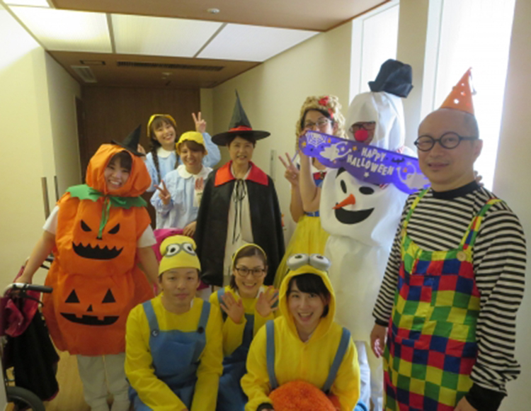 ☆☆☆ハッピー ハロウィン☆☆☆ 10月に入ってからホスピス病棟の飾り付けもハロウィン一色です。 いつもと違った雰囲気で少しワクワクするのは私だけでしょうか。 17日の本日、ホスピス病棟では、医師・看護師が仮装をしてお部屋を回り、入院患者さん達と楽しい時間を過ごしました。医師・看護師併せて10名ほどが病棟内を練り歩く姿は、病院とは思えない感じです(笑)。 お部屋内では、お菓子を配ったり患者さんにも簡単な仮装をしてもらいみんなで記念写真を撮りました。