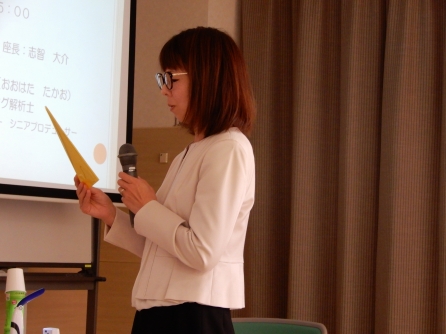 特別講演は「働き方改革~あなたが作るチームの魔法~」の演題で、大畠崇央氏(上級マーケティング解析士/元フォルトディズニーシニアプロデューサー)をお招きしての講演でした。この写真は看護課長&病院学会委員の吉本さんですが、講演の冒頭で隣の人とTDLのジャングルクルーズの船長さんの最初の台詞をお互いに言い合う時間があり、あまりに素敵な話しっぷりに全体で披露の指名を受けたところです。拍手~でした。