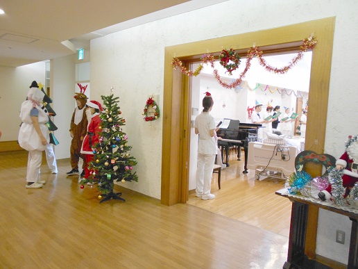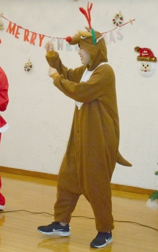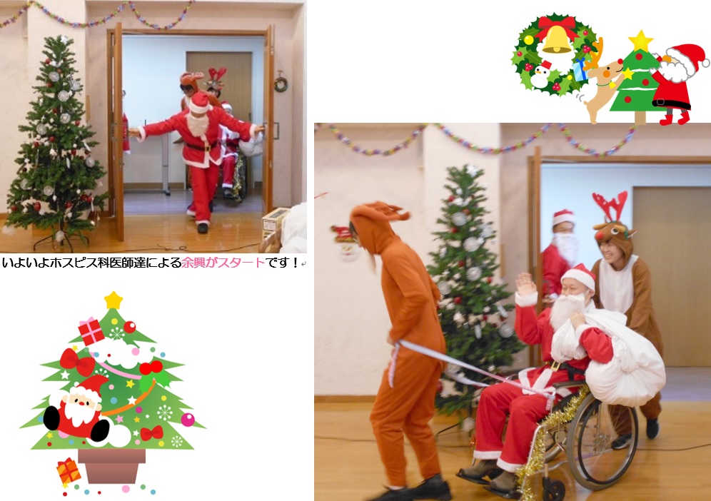 サンタ役のホスピス科I所長が2年目のI先生扮するトナカイにひかれて会場入りする演出☆