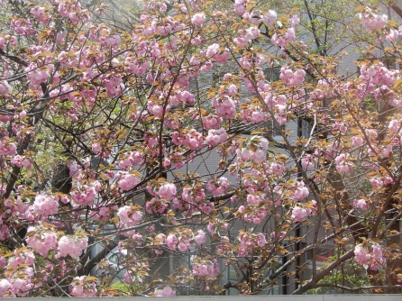 管理室の窓から見える八重桜もそろそろ葉っぱが見えてきました。