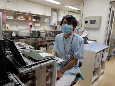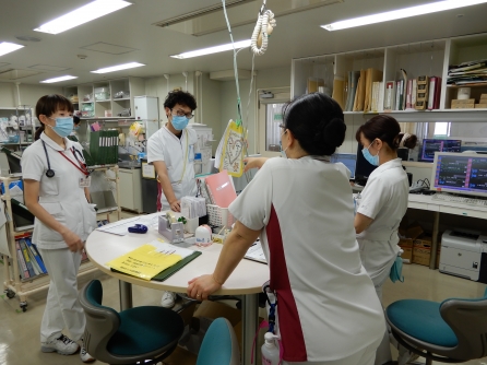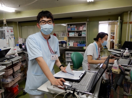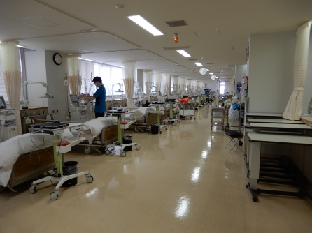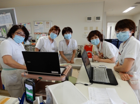透析室です。こちらもカンファレンス中でした。カメラを向けると「マスク取った方がいいですか?」と聞かれたので「そのままでOKで~す」と応えると、「マスクしているから年が分からんでちょうどいい!」とTさん(大笑)。いつも明るいベテランチームです。