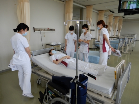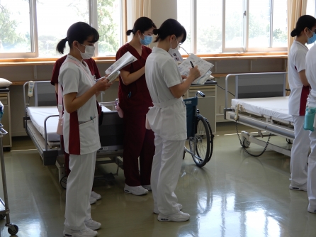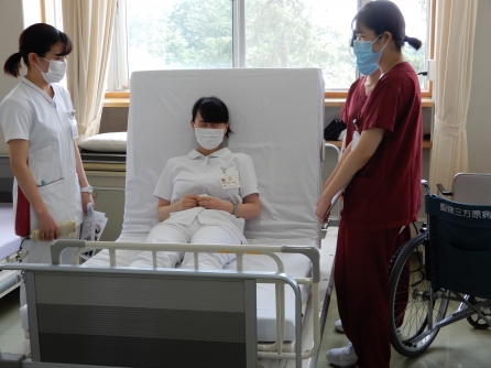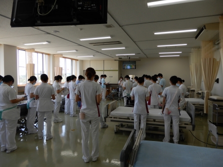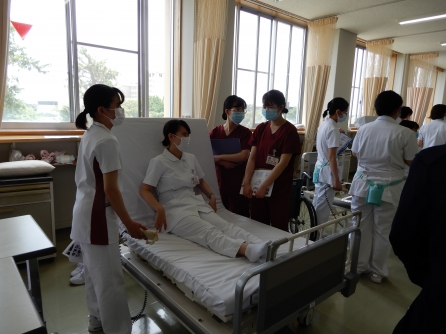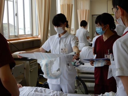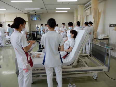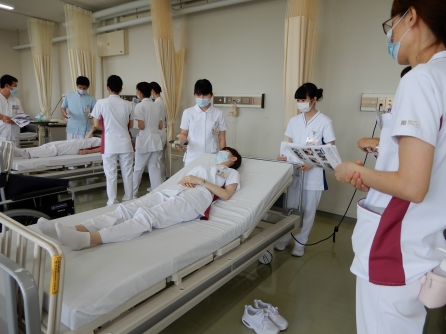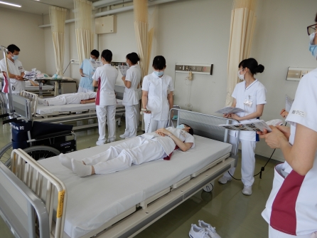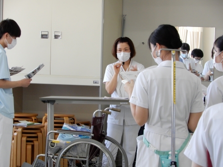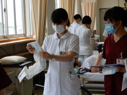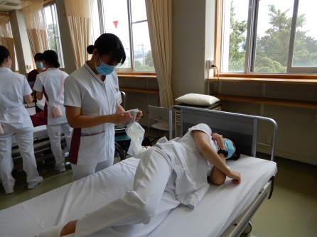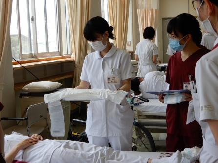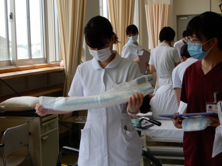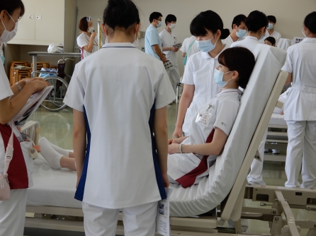 それぞれが体験。たったこれだけの演習でも患者さんの気持ちが分かり、看護実践につながります。