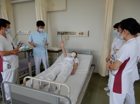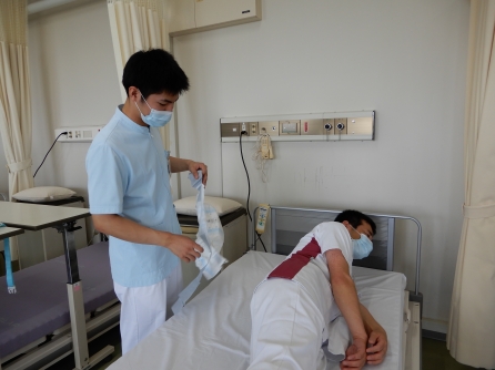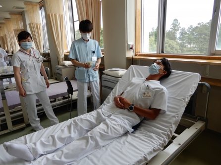 自分では動けない設定なので体まで左に傾いています。患者さんの不快、苦痛を実感出来ましたね。