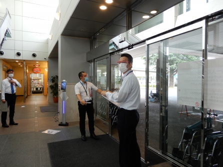 29日は体温計と1つ目のドアの横に設置して行いました。事務の方々も慣れない健康チェック、直ぐに慣れていた様子です。